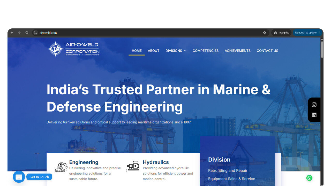 The Air-O-Weld Corporation website highlights their legacy of excellence in marine and defense engineering since 1997. Showcasing their expertise in ship refits, equipment overhauls, and underwater welding, the site reflects their strong operational presence across Mumbai, Goa, and Karwar. It effectively communicates their trusted collaborations with the Indian Navy and Goa Shipyard Ltd., emphasizing precision, safety, and reliability.