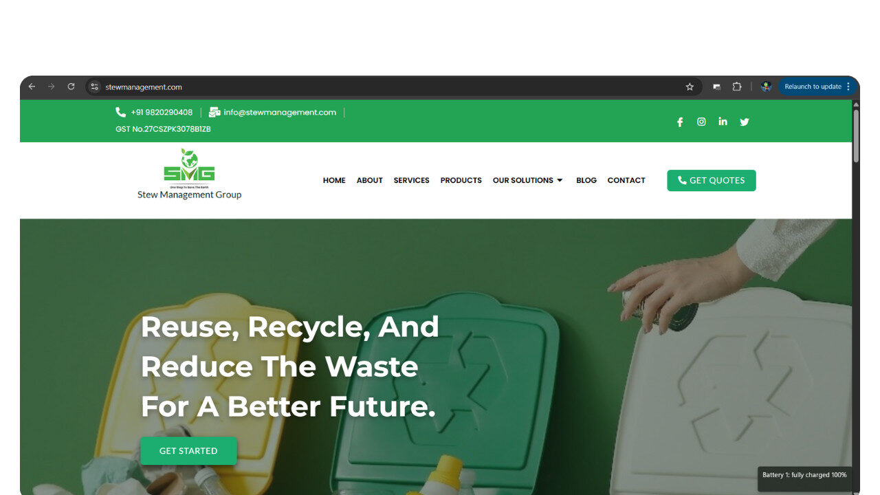 A clean, modern website designed and developed for Stew Management Group, a company offering end-to-end waste management services based on the principles of a circular economy. The site highlights their sustainable approach to handling waste for MNCs, tech parks, and residential communities — emphasizing their mission to help organizations achieve zero waste to landfill.