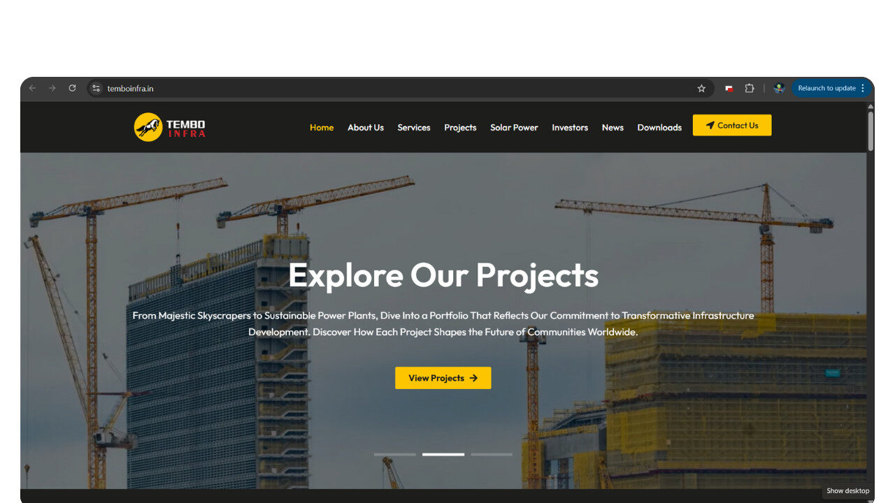 Tembo Global Infra’s website was designed to reflect the company’s strength in infrastructure, engineering, and industrial development. The site features a modern layout, clear navigation, and showcases their major projects and capabilities—highlighting innovation, quality, and reliability in every detail.